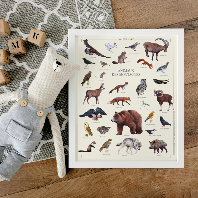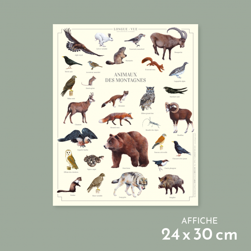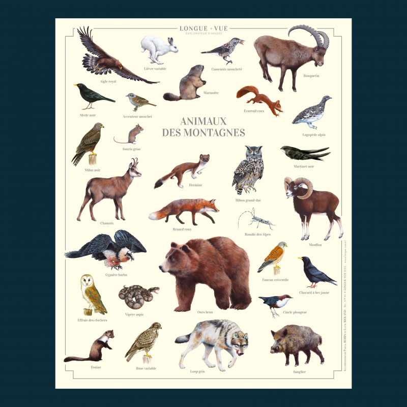 Affiche 24 x 30 cm - Animaux des montagnes - Illustrations de Lucye Rioland et Pascal Robin - Collection Animaux des montagnes - Couleur du fond : Beige.