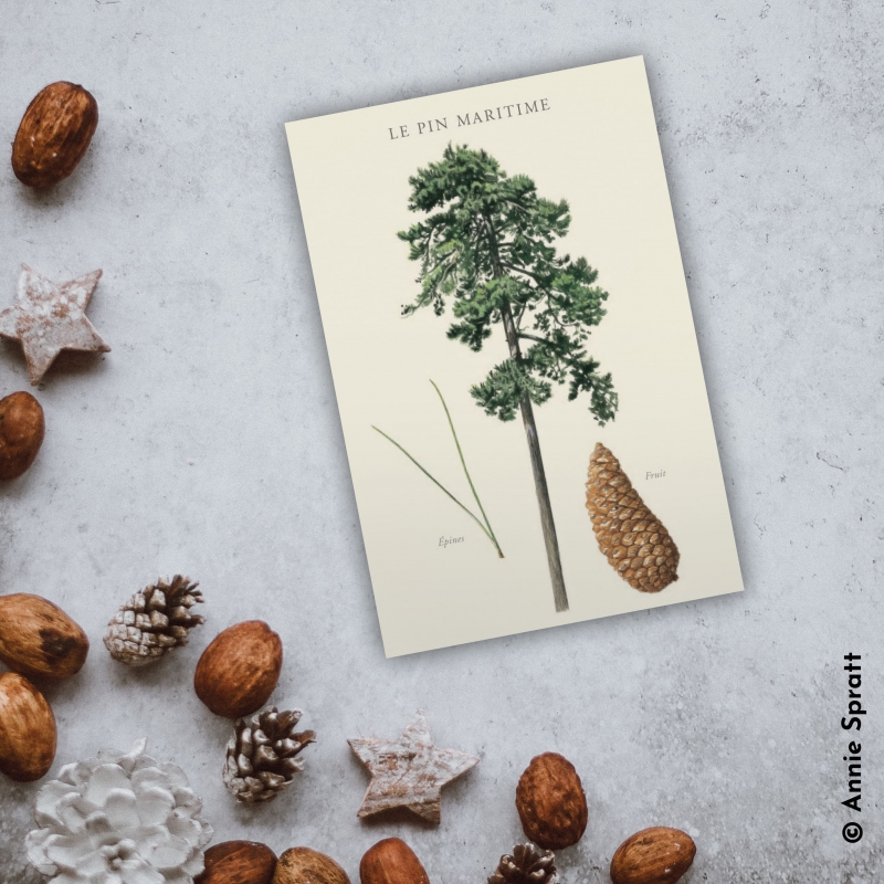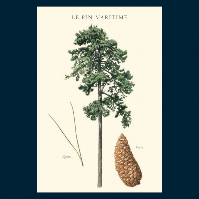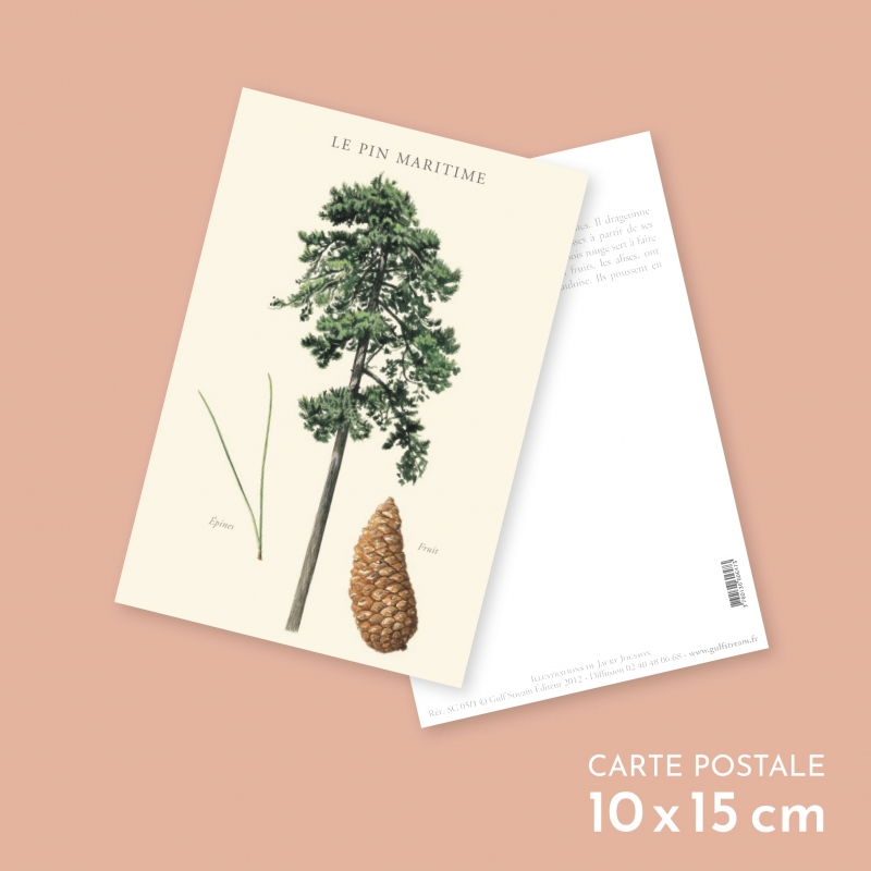 Carte postale 10 x 15 cm - Pin maritime - Illustration de Jacky JOUSSON - Collection Arbres. Pin maritime : Résineux Longévité : + de 200 ans Taille : 30 mètres. Le pin maritime affectionne les climats doux à chauds. Autrefois on utilisait sa résine pour fabriquer un diluant : l’essence de térébenthine. De son bois, on fait des parquets, des meubles, du papier… C’est le premier arbre récolté en France : les forêts de pins maritimes, présentes essentiellement dans les Landes, couvrent 10 % de la surface boisée du pays.