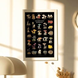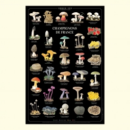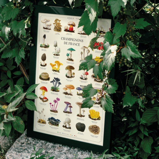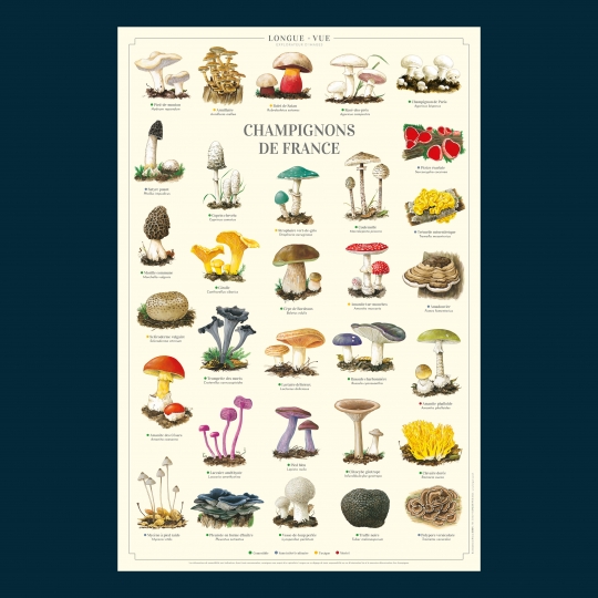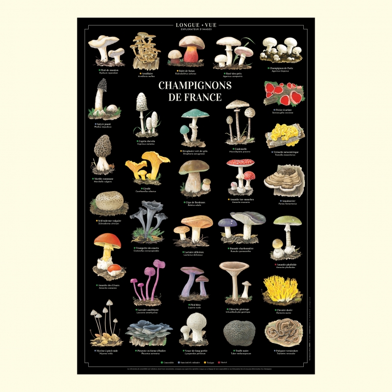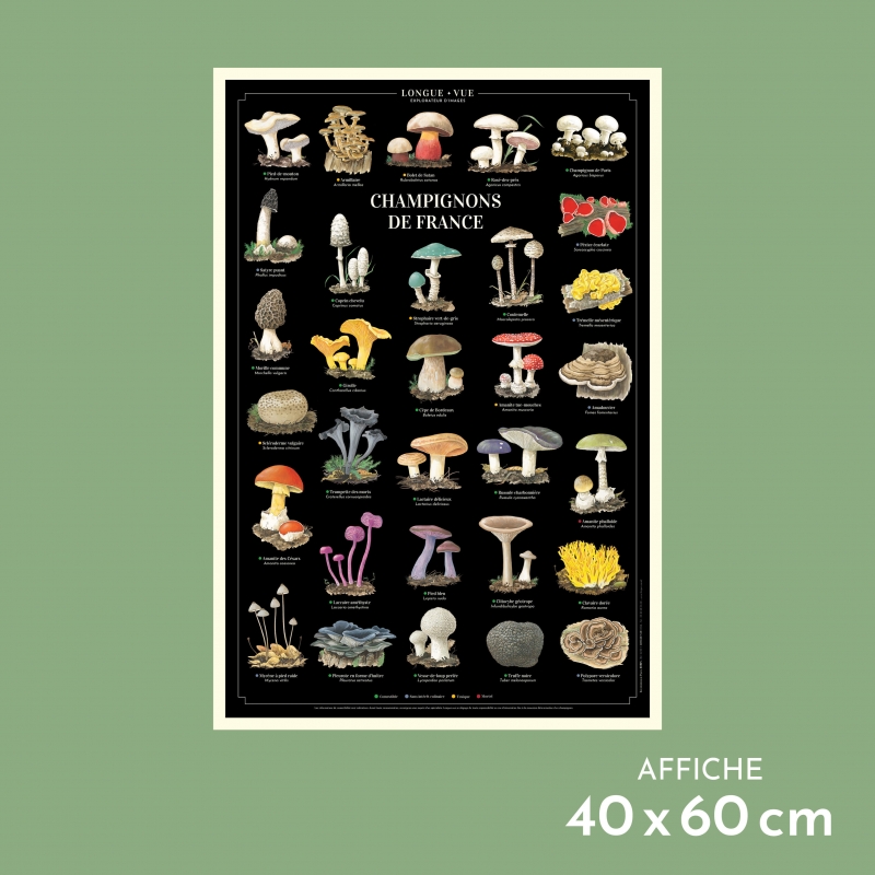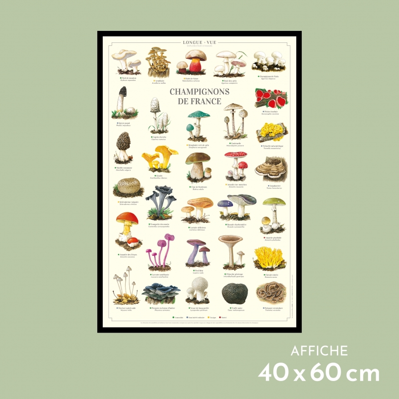 Affiche 40 x 60 cm - Champignons de France - Illustration de Pascal ROBIN - Collection Champignons. Champignons de France : Existe aussi en carte double 42 x 10 cm. (1) Comestible (2) Sans intérêt culinaire (3) Toxique (4) Mortel 1. Pied-de-mouton (Hydnum repandum) (1) 2. Armillaire (Armillaria mellea) (3) 3. Bolet de Satan (Rubroboletus satanas) (3) 4. Rosé-des-prés (Agaricus campestris) (1) 5. Champignon de Paris (Agaricus bisporus) (1) 6. Satyre puant (Phallus impudicus) (2) 7. Pézize écarlate (Sarcoscypha coccinea) (2) 8. Trémelle mésentérique (Tremella mesenterica) (2) 9. Morille commune (Morchella vulgaris) (1) 10. Coprin chevelu (Coprinus comatus) (1) 11. Strophaire vert-de-gris (Stropharia aeruginosa) (3) 12. Coulemelle (Macrolepiota procera) (1) 13. Amadouvier (Fomes fomentarius) (2) 14. Trompette-de-la-mort (Craterellus cornucopioides) (1) 15. Girolle (Cantharellus cibarius) (1) 16. Cèpe de Bordeaux (Boletus edulis) (1) 17. Amanite tue-mouches (Amanita muscaria) (3) 18. Amanite phalloïde (Amanita phalloides) (4) 19. Amanite des Césars (Amanita caesarea) (1) 20. Scléroderme vulgaire (Scleroderma citrinum) (3) 21. Lactaire délicieux (Lactarius deliciosus) (1) 22. Russule charbonnière (Russula cyanoxantha) (1) 23. Pleurote en forme d’huître (Pleurotus ostreatus) (1) 24. Pied bleu (Lepista nuda) (1) 25. Clavaire dorée (Ramaria aurea) (1) 26. Clitocybe géotrope (Infundibulicybe geotropa) (1) 27. Mycène à pied raide (Mycena vitilis) (2) 28. Polypore versicolore (Trametes versicolor) (2) 29. Vesse-de-loup perlée (Lycoperdon perlatum) (1) 30. Truffe noire (Tuber melanosporum) (1) 31. Laccaire améthyste (Laccaria amethystina) (1) Les informations de comestibilité sont indicatives. Avant toute consommation, renseignez-vous auprès d’un spécialiste. Longue-vue se dégage de toute responsabilité en cas d’intoxication liée à la mauvaise détermination d’un champignon. Sauvegarder la biodiversité, c’est aussi protéger les variétés et les espèces végétales cultivées.