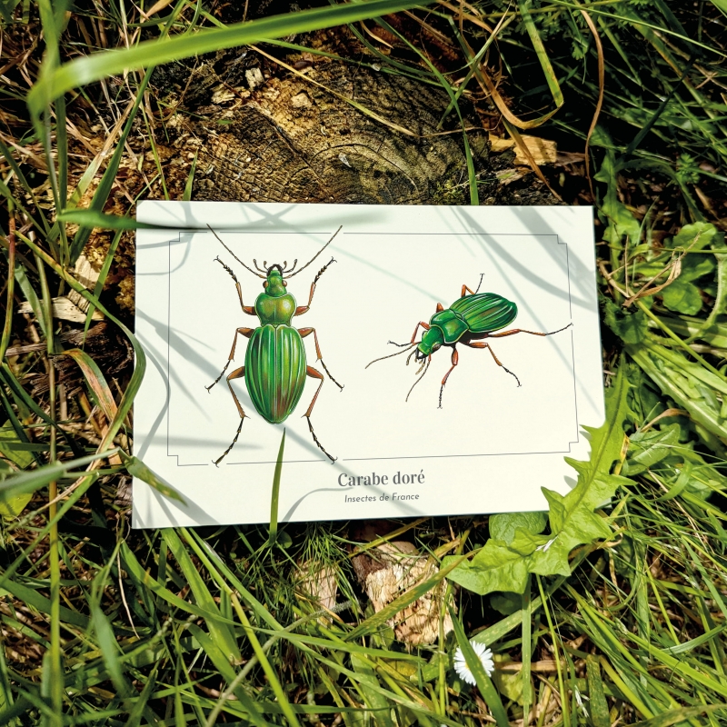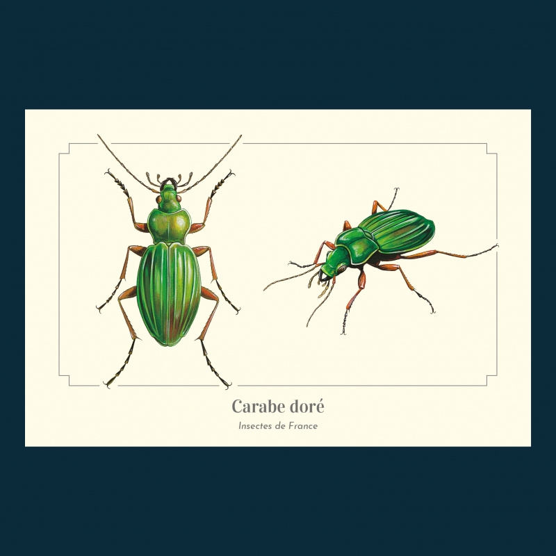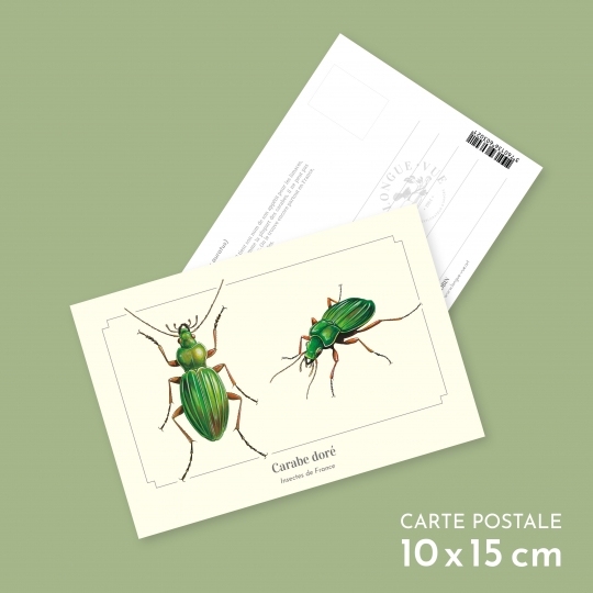 Carte postale 10 x 15 cm - Carabe doré - Illustration de Pascal ROBIN - Collection Coléoptères. Carabe doré : Taille : de 25 à 35 mm.