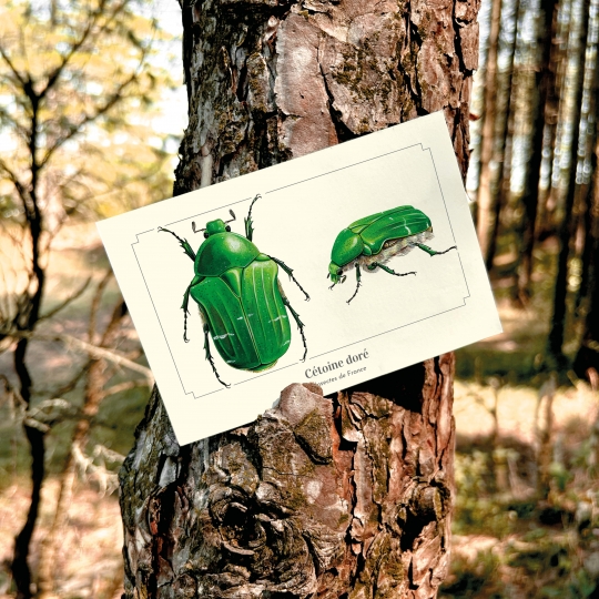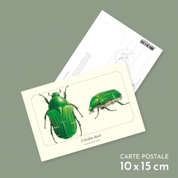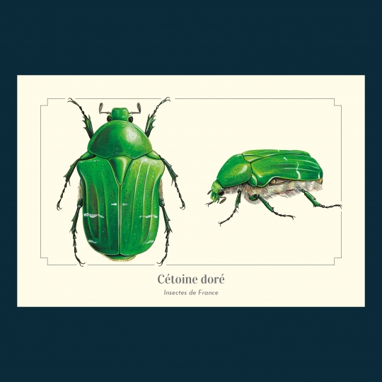 Carte postale 10 x 15 cm - Cétoine dorée - Illustration de Pascal ROBIN - Collection Coléoptères. Cétoine dorée : Taille : de 15 à 20 mm. Aussi appelée hanneton des roses, la cétoine affectionne particulièrement ce type de fleurs. La cétoine vole assez facilement, mais ses élytes restent fermés, l'aile membraneuse se glissant sur le côté. De nombreuses couleurs sont observables, mais le vert métallique prédomine.