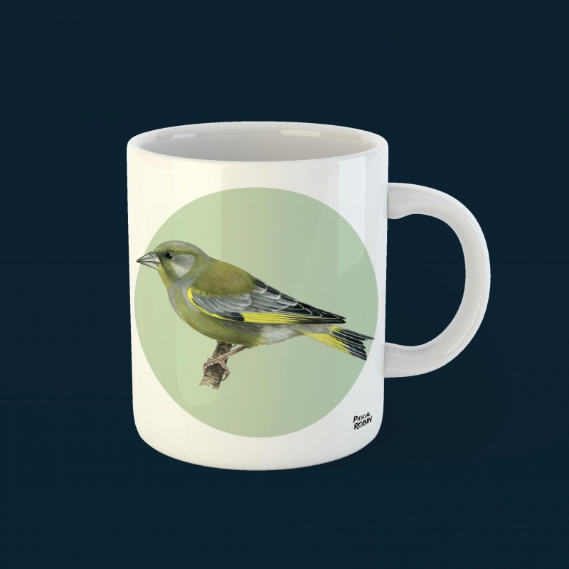 Mug 325 ml - Verdier d'Europe - Illustration de Pascal ROBIN - Collection Oiseaux des jardins et des haies. Verdier d'Europe : Taille : environ 16 cm, envergure : de 25 à 30 cm, poids : de 25 à 35 g, longévité : 13 ans. Le verdier d'Europe est un petit passereau partiellement migrateur au corps trapu. Son bec conique et puissant lui permet de se nourrir de grosses graines, notamment en hiver, mais aussi de baies et de bourgeons. Il raffole des graines de tournesol. On peut l'observer aux lisières des zones boisées et buissonneuses, dans les parcs et les jardins. Il est courant de l'entendre chanter pendant son vol, qui est ondulant.