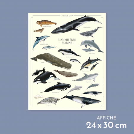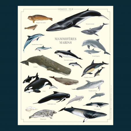 Phoque veau-marin - Rorqual commun - Dauphin bleu et blanc - Marsouin commun - Cachalot - Grand dauphin - Dauphin commun - Orque - Globicéphale noir - Dauphin de Risso - Phoque gris - Petit rorqual
