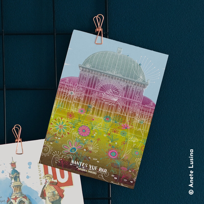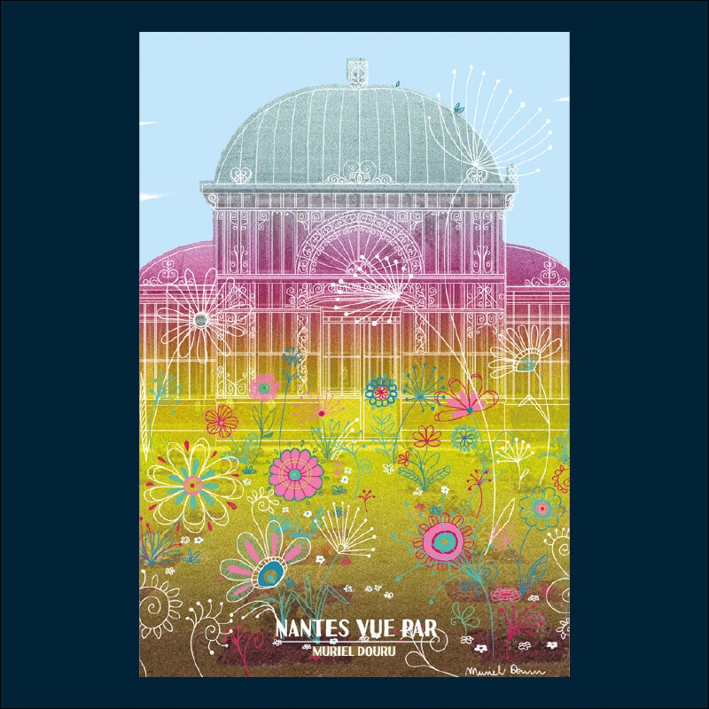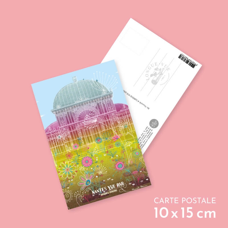 Carte postale 10 x 15 cm - Grande serre du Jardin des plantes - Illustration de Muriel DOURU - Collection Nantes - Couleur du fond : Beige.