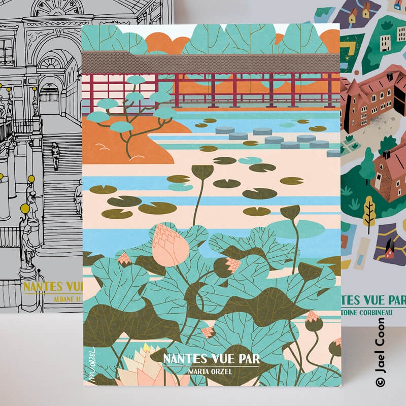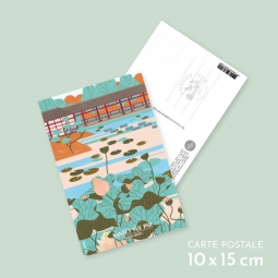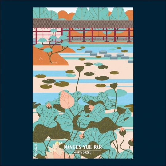 Carte postale 10 x 15 cm - Promenade japonaise et nénuphars sur l'île de Versailles - Illustration de Marta ORZEL - Collection Nantes - Couleur du fond : Beige.