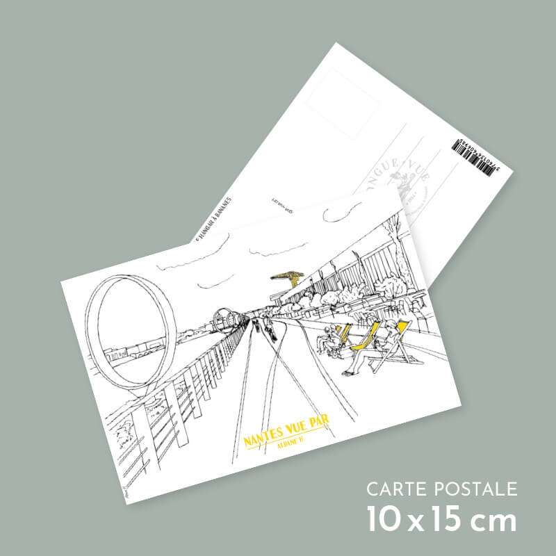 Carte postale 10 x 15 cm - Quai des Antilles, vu du hangar à bananes - Illustration d'ALBANE H - Collection Nantes - Couleur du fond : Beige.
