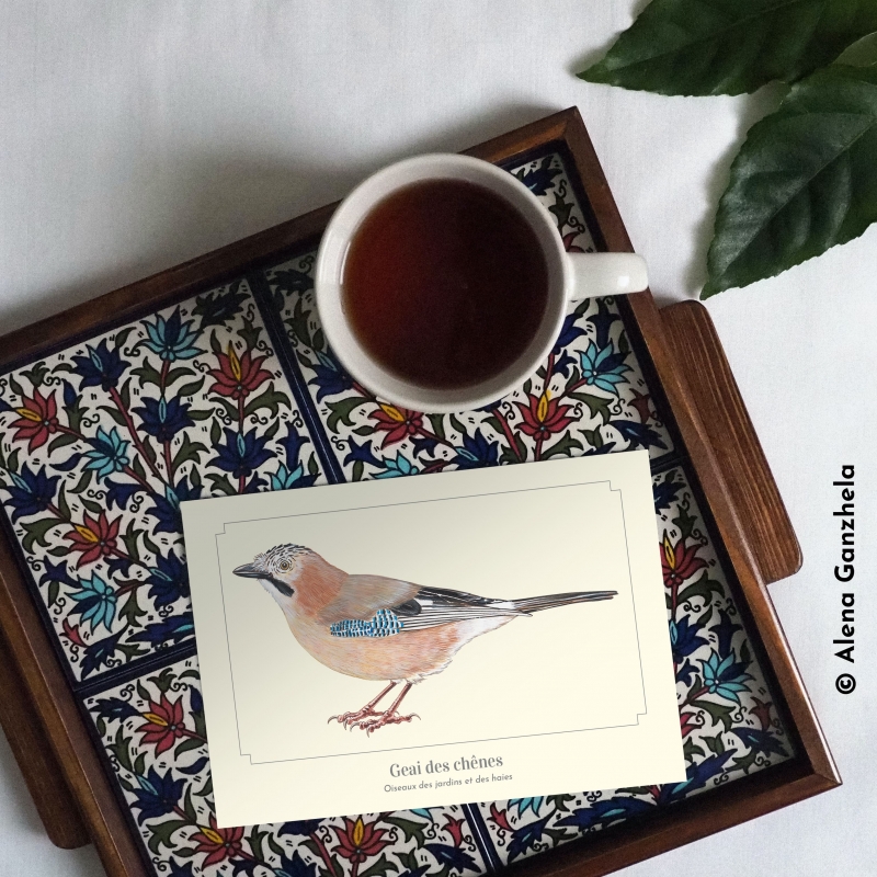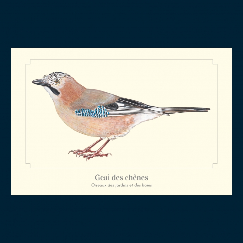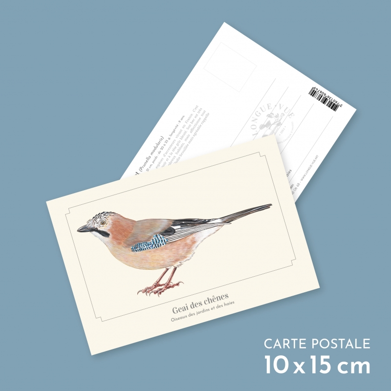 Carte postale 10 x 15 cm - Geai des chênes - Illustration de Pascal Robin - Collection Oiseaux des jardins et des haies. Le Geai des chênes : Taille : de 30 à 36 cm, envergure : de 55 à 60 cm, poids : de 150 à 200 g, longévité : 18 ans. Le geai des chênes fait partie des rares oiseaux qui stockent de la nourriture pour l’hiver. Sa capacité à mémoriser des points de repère ne lui permet pas toujours de retrouver ses cachettes, ce qui contribue ainsi à la dissémination des chênes. Grâce à son large registre vocal, il est capable d’imiter d’autres oiseaux, mais reste très reconnaissable par son plumage bigarré aux couleurs vives. Si fruits et graines constituent une partie non négligeable de son menu, il chasse aussi des lézards, des campagnols et n’hésite pas à piller des nids.