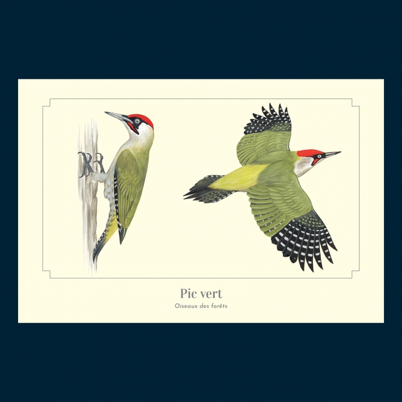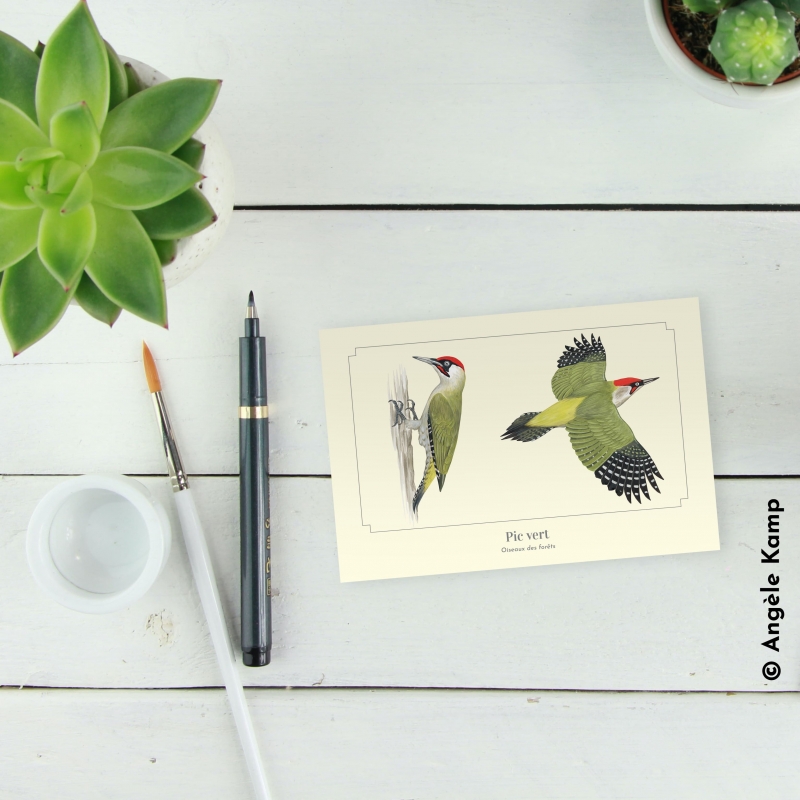 Carte postale 10 x 15 cm - Pic vert - Illustration de Pascal Robin - Collection Oiseaux des forêts. Le Pic vert: Taille : environ 33 cm, envergure : de 40 à 45 cm, poids : de 180 à 220 g, longévité : 7 ans. Le pic vert se nourrit presque exclusivement de fourmis, qu'il attrape avec sa longue langue collante et visqueuse, capable de sortir d'environ dix centimètres de son bec. Les doigts du pic vert sont pourvus d'ongles solides et en opposition : deux dirigés vers l'avant et deux dirigés vers l'arrière, ce qui lui permet de s'accrocher fermement et de grimper aux arbres tout en s'appuyant sur les plumes robustes de sa queue.