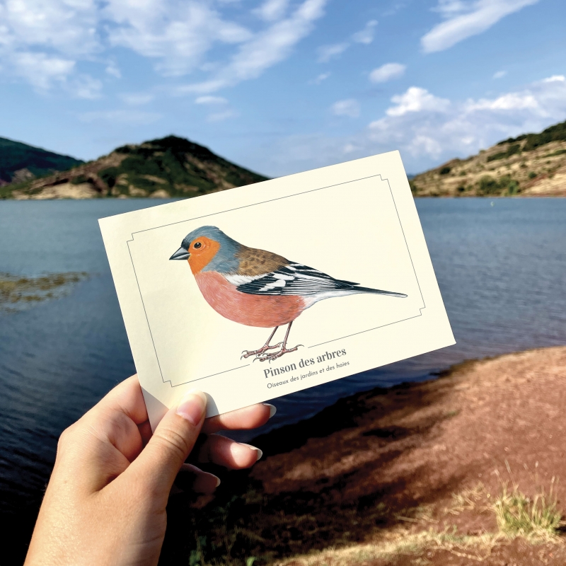 Carte postale 10 x 15 cm - Pinson des arbres - Illustration de Pascal Robin - Collection Oiseaux des jardins et des haies. Le Pinson des arbres : Taille : de 14 à 16 cm, envergure : de 24 à 26 cm, poids : de 17 à 30 g, longévité : 14 ans. Le pinson des arbres est la plus répandue des trois espèces de pinsons. Cet oiseau partiellement migrateur est très territorial pendant la saison de reproduction. Son vol est ondulant. Son chant est une série courte et puissante de notes descendantes, finissant en fioritures avec beaucoup de variations. Il se nourrit de graines, de petits fruits et d'invertébrés tels que des araignées, des chenilles, des insectes.