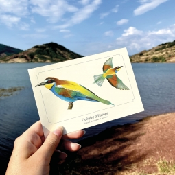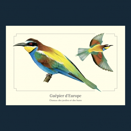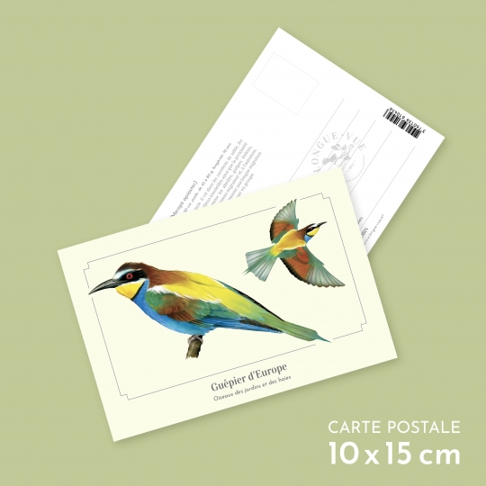 Carte postale 10 x 15 cm - Guêpier d'Europe - Illustration de Pascal ROBIN - Collection Oiseaux des jardins et des haies. Guêpier d'Europe : Taille : environ 28 cm, envergure : de 40 à 50 cm, poids : de 45 à 80 g, longévité : 10 ans. Le guêpier d’Europe est de la taille d’un merle. Il vit dans les carrières de sable, les falaises, les haies, les bocages… et préfère les milieux ensoleillés ainsi que la proximité des cours d’eau. Il mange différents insectes comme les abeilles, guêpes, frelons, bourdons, mouches, papillons, sauterelles… C’est un oiseau migrateur et, à l’automne, quand son alimentation préférée n’est plus disponible, il entame une longue migration jusqu’en Afrique. Ils chassent en groupe le jour.
