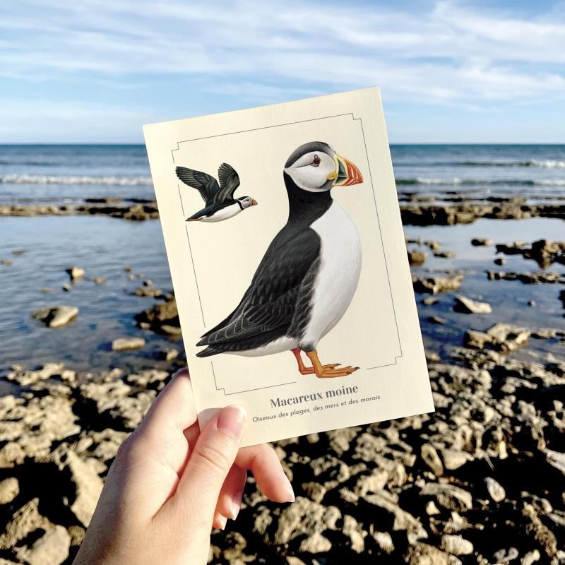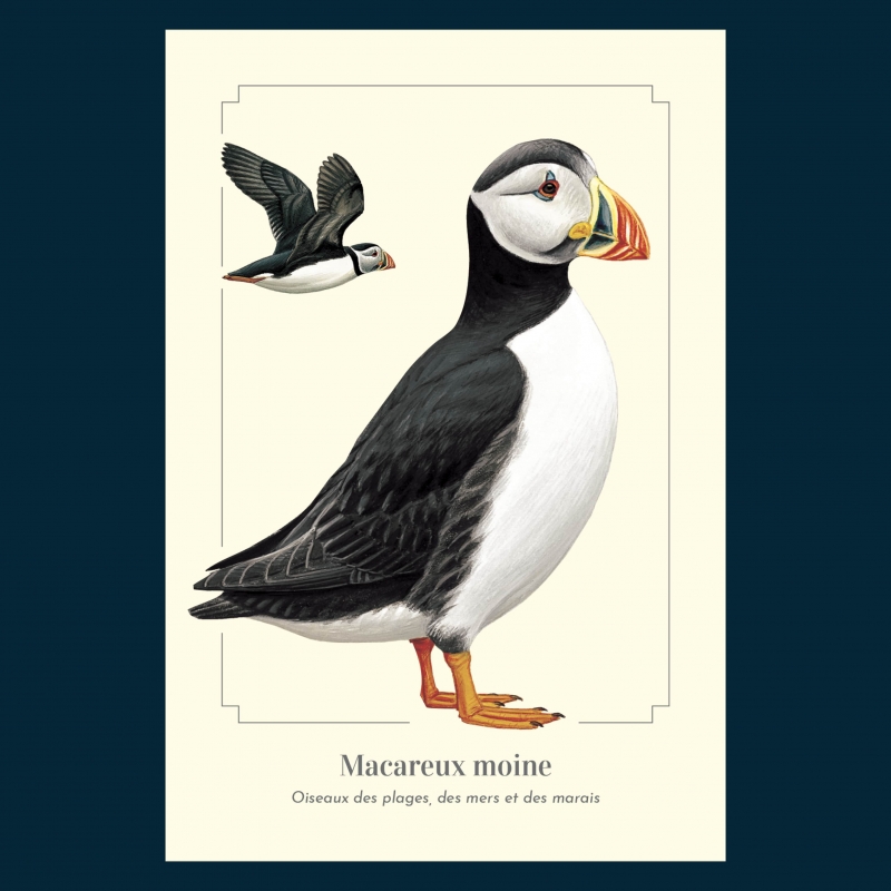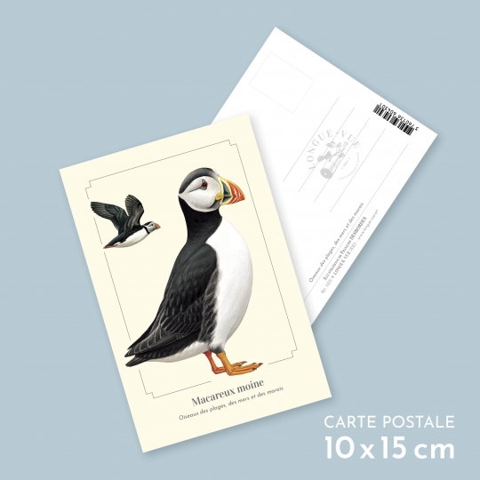Carte postale 10 x 15 cm - Macareux moine - Illustration de François Desbordes - Collection Oiseaux des plages, des mers et des marais. Le Macareux moine : Taille : de 28 à 37 cm, envergure : de 47 à 63 cm, poids : de 320 à 550 g, longévité : 22 ans. Chassé à outrance au début du XXe siècle, il est à l'origine de la réserve d'oiseaux marins des Sept-Îles et de la création de la LPO (Ligue de protection des oiseaux) en 1912, dont il est l'emblème. Il est aujourd'hui menacé par les marées noires et l'épuisement des ressources en poissons. Ses effectifs sont en effet passés de 8 500 couples en 1917 à 230 en 2020.