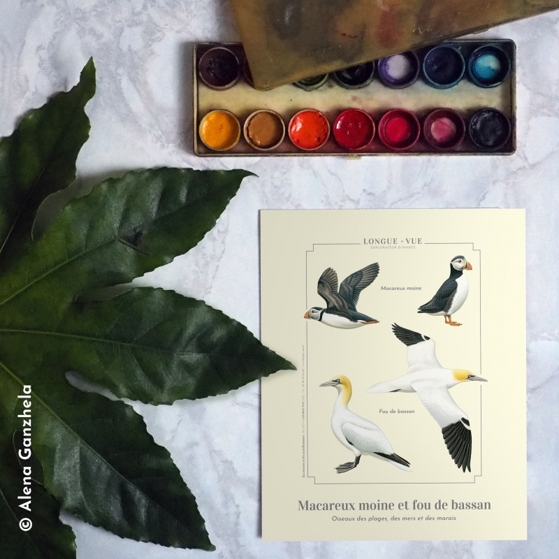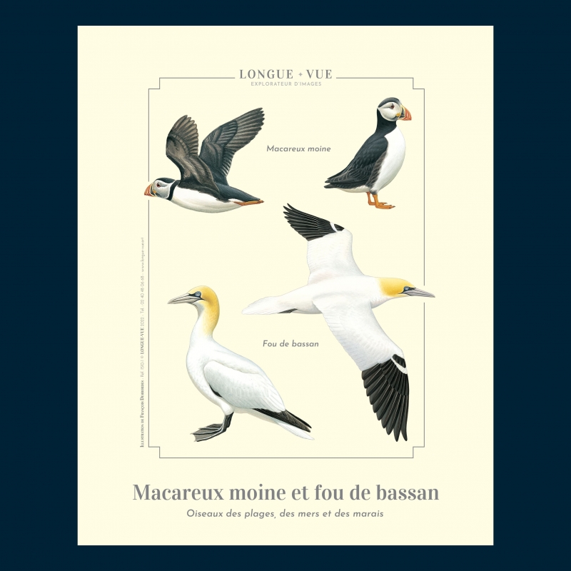 Affiche 24 x 30 cm - Macareux moine et fou de bassan - Illustration de François Desbordes - Collection Oiseaux des plages, des mers et des marais. Le Macareux moine et fou de bassan: Macareux moine (Fratercula arctica) Taille : de 28 à 37 cm, envergure : de 47 à 63 cm, poids : de 320 à 550 g, longévité : 22 ans. Chassé à outrance au début du XXe siècle, il est à l'origine de la réserve d'oiseaux marins des Sept-Îles et de la création de la LPO (Ligue de protection des oiseaux) en 1912, dont il est l'emblème. Il est aujourd'hui menacé par les marées noires et l'épuisement des ressources en poissons. Ses effectifs sont en effet passés de 8 500 couples en 1917 à 230 en 2020. Fou de Bassan (Morus bassanus) Taille : de 80 à 100 cm, envergure : de 165 à 180 cm, poids : de 2 800 à 3 200 g, longévité : 21 ans. L’unique colonie française de fous de Bassan se situe sur l'île Rouzic, dans la réserve des Sept-Îles. Cet oiseau est capable d'effectuer des plongeons en piqué depuis une trentaine de mètres de hauteur, perforant l’eau telle une flèche pour capturer les poissons.