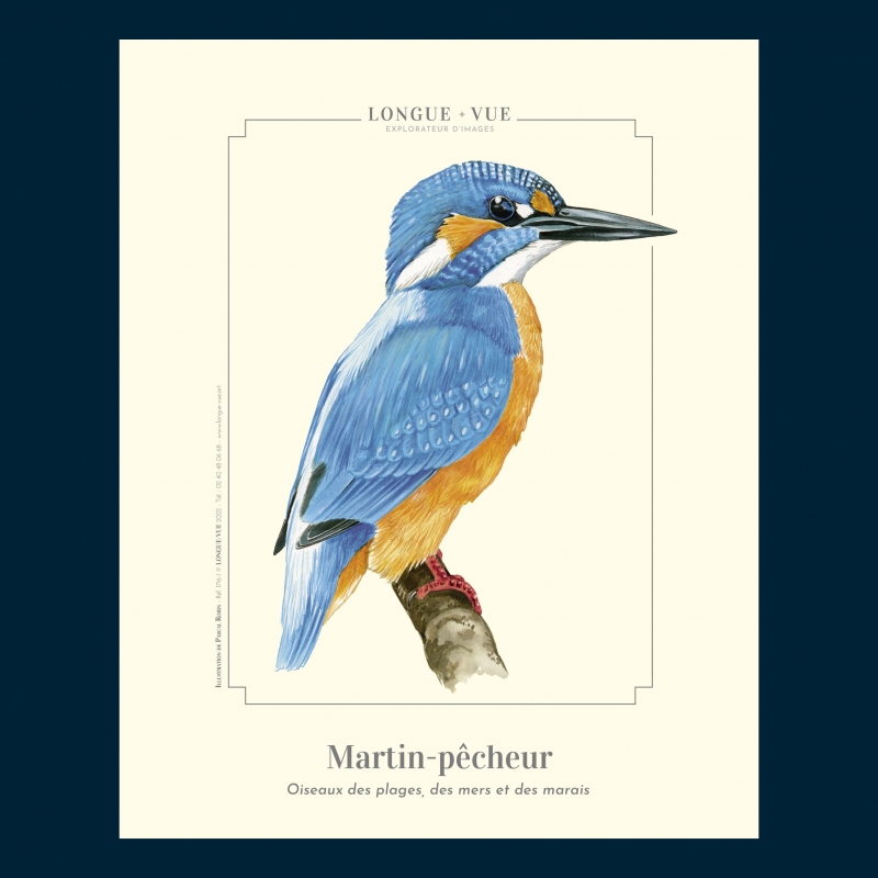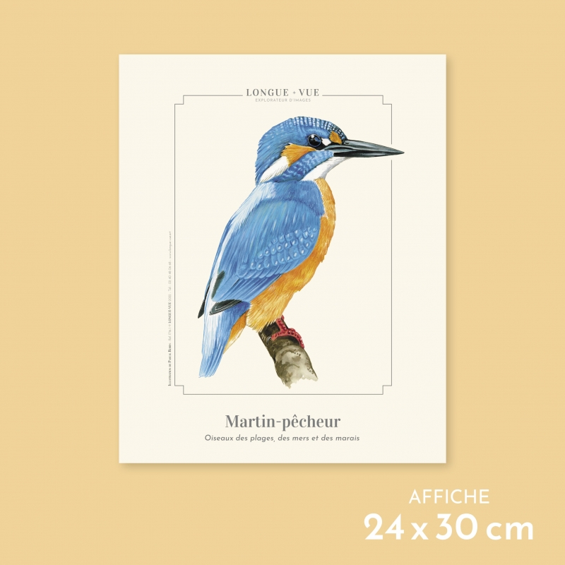 Affiche 24 x 30 cm - Martin pêcheur - Illustration de Pascal Robin - Collection Oiseaux des plages, des mers et des marais. Le Martin pêcheur: Taille : environ 16 cm, envergure : de 24 à 26 cm, poids : de 30 à 45 g, longévité : 15 ans. Le martin-pêcheur vit au bord des eaux calmes, propres et peu profondes afin de repérer ses proies, privilégiant des lieux abrités du vent et des vagues. Il n'est pas facile à voir car ses couleurs métalliques, vives pourtant, constituent un excellent camouflage lorsqu'il file au ras de l'eau.