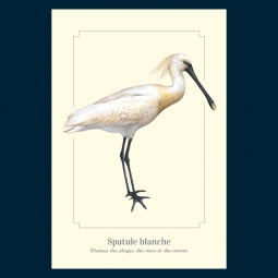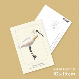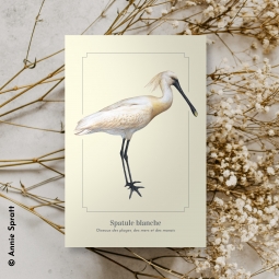 Carte postale 10 x 15 cm - Spatule blanche - Illustration d’Isabelle Arslanian - Collection Oiseaux des plages, des mers et des marais. Le Spatule blanche: Taille : environ 95 cm, envergure : de 115 à 135 cm, poids : de 1 200 à 1 700 g, longévité : 28 ans. La spatule blanche est un grand oiseau échassier au plumage blanc, reconnaissable grâce à son bec long et spatulé qui lui permet de filtrer l’eau pour retenir toutes sortes d’invertébrés et de petits vertébrés (crustacés, vers, larves d’insectes, poissons). La spatule est le plus souvent silencieuse, comme sa cousines la cigogne. Elle habite les grandes zones humides des littoraux.