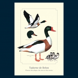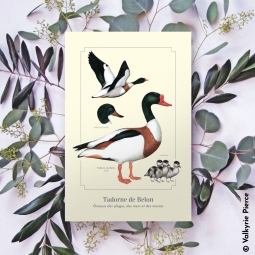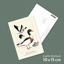 Carte postale 10 x 15 cm - Tadorne de Belon - Illustration d’Isabelle Arslanian - Collection Oiseaux des plages, des mers et des marais. Le Tadorne de Belon : Taille : de 58 à 67 cm, envergure : de 110 à 133 cm, poids : de 560 à 1 500 g, longévité : 16 ans. Ce grand canard marin est un original : la femelle revêt un plumage aussi bariolé que le mâle, si bien qu’elle installe son nid dans un terrier de lapin, et les canetons de plusieurs nichées sont regroupés en crèche sous la surveillance d’un adulte.