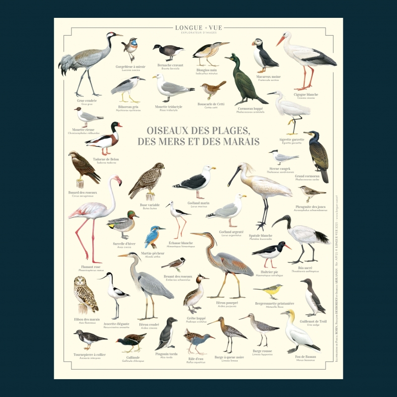 Oiseaux des plages, des mers et des marais : Existe aussi en poster 40 x 60 cm et 60 x 20 cm mais aussi en carte double 42 x 10 cm
