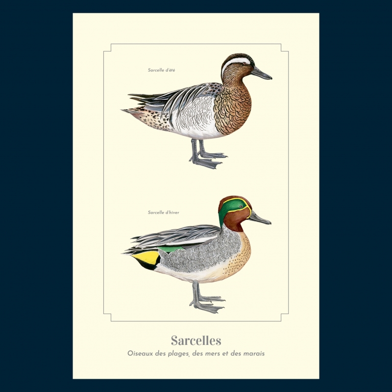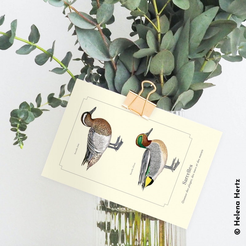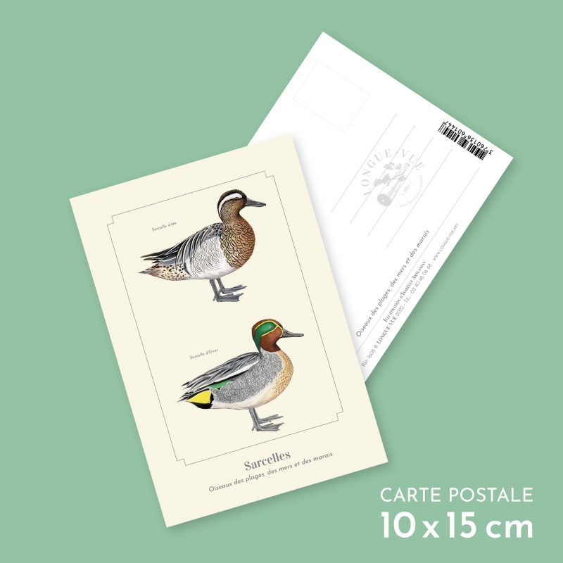 Carte postale 10 x 15 cm - Sarcelles - Illustration de Pascal Robin - Collection Oiseaux des plages, des mers et des marais. Le Sarcelles : Sarcelle d’été (Spatula querquedula) Taille : de 37 à 41 cm, envergure : de 58 à 69 cm, poids : de 300 à 440 g, longévité : 20 ans. Sarcelle d’hiver (Anas crecca) Taille : de 34 à 38 cm, envergure : de 54 à 59 cm, poids : de 250 à 400 g, longévité : 16 ans. En France, la population de la sarcelle d’été est répartie dans les marais de l’ouest, entre la Loire et la Gironde. C’est la seule espèce de canard à quitter totalement notre continent en hiver. Elle est omnivore, et sa quête de nourriture s’effectue en eaux peu profondes. La sarcelle d’hiver est le plus petit canard d’eau douce d’Europe. C’est un oiseau très sociable qui vit toujours en groupe.