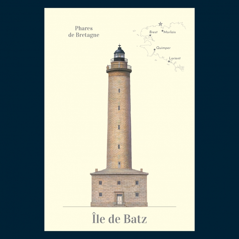 Carte postale 10 x 15 cm - Phares - Illustration d'Emmanuelle ÉTIENNE - Collection Phares de Bretagne - Ile de Batz : 1836, 45 m (198 marches), feu à 4 éclats blancs groupés toutes les 25 secondes. Coordonnées : Latitude 48°44 N - Longitude 04°01 W. Le phare se dresse sur la colline la plus élevée de l’île de Batz, au milieu des champs, et rayonne à plus de 70 mètres au-dessus des eaux. Il a été construit sur les mêmes plans que celui de Penmarc’h. Du haut de ses 198 marches, la tour offre une vue admirable sur l’île, la baie et la ville de Roscoff. Le phare de Batz n’est aujourd’hui plus gardienné, mais reste ouvert au public.