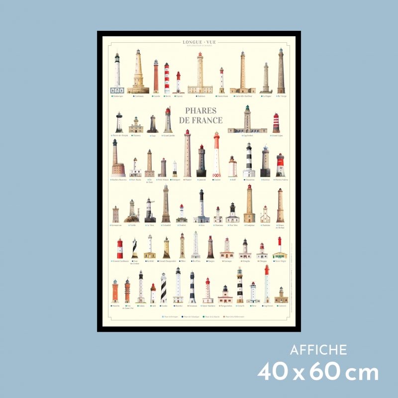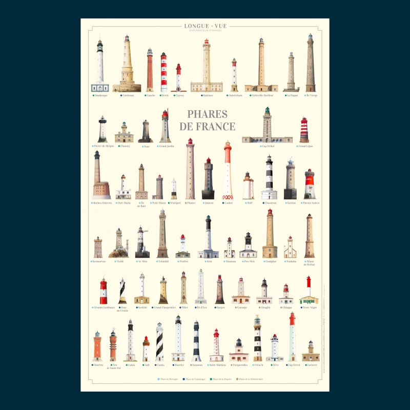 Dunkerque ; Cordouan ; Canche ; Berck ; Cayeux ; Baleines ; Ouistreham ; Gatteville-Barfleur ; La Hague ; Île Vierge ; Pierre-de-Herpin ; Chausey ; Four ; Grand Jardin ; Cap Fréhel ; Grand Léjon ; Roches-Douvres ; Port-Maria ; Île de Batz ; Petit Minou ; Sénéquet ; Planier ; Jument ; Coubre ; Stiff ; Chassiron ; Kéréon ; Pierres-Noires ; Kermorvan ; Vieille ; Ar-Men ; Eckmülh ; Penfret ; Sein ; Moutons ; Pen-Men ; Goulphar ; Poulains ; Héaux de Bréhat ; Grands Cardinaux ; Four du Croisic ; Kerlédé ; Grand-Charpentier ; Pilier ; Île d'Yeu ; Barges ; Garoupe ; Giraglia ; Chiappa ; Terre-Nègre ; Hourtin ; Feu Saint-Pol ; Calais ; Ault ; Contis ; Biarritz ; Faraman ; Saint-Mathieu ; Porquerolles ; Créac'h ; Hève ; Cap Ferret ; Carteret ; Trezien.