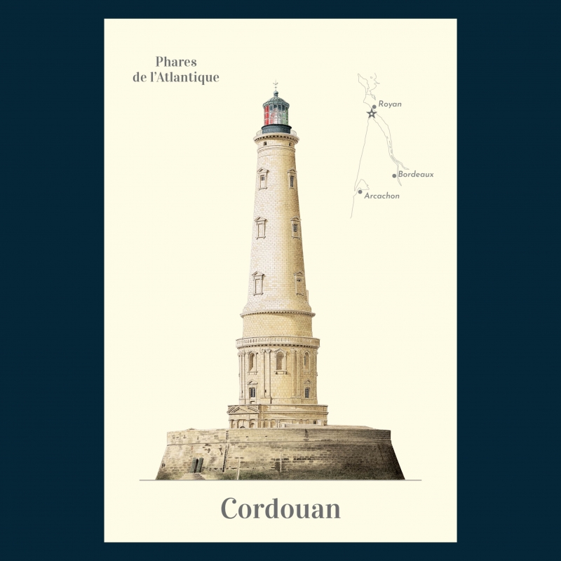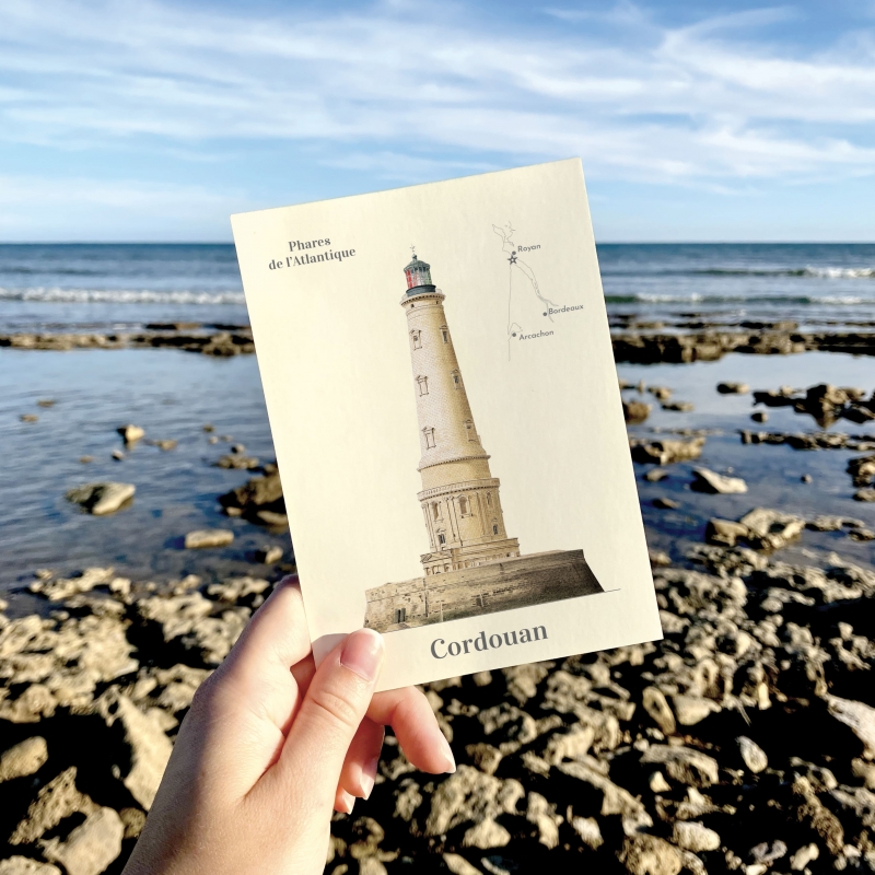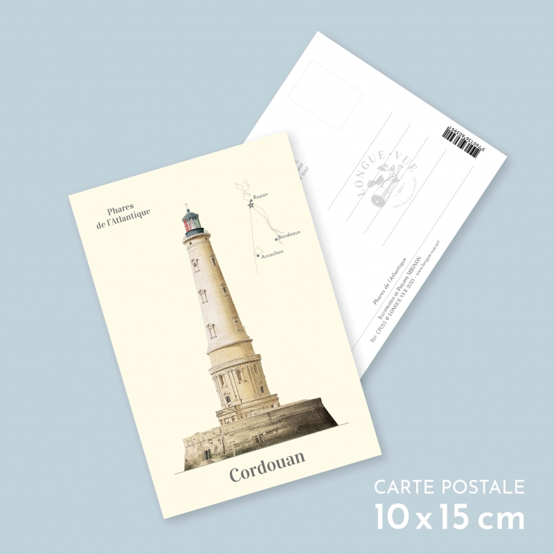 Carte postale 10 x 15 cm - Phares - Illustration de Philippe MIGNON - Collection Phares de l'Atlantique - Cordouan : 1611, 67,50 m (311 marches), feu à 2 + 1 occultations toutes les 12 secondes, secteurs blanc, rouge, vert. Coordonnées : Latitude 48°35 N - Longitude 01°10 W. Le phare de Cordouan est le plus ancien des phares français en activité. Il est classé monument historique en 1862 et électrifié en 1948. Il est surnommé le « Versailles de la mer » pour sa splendeur, et l’origine de son nom est obscure. Selon la légende, il serait hérité de l’époque où des négociants espagnols arrivant de Cordoue venaient chercher des vins à Bordeaux. Ces négociants demandèrent et obtinrent qu’une tour soit construite à l’entrée de l’embouchure de la Gironde.