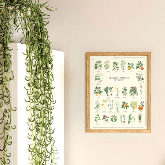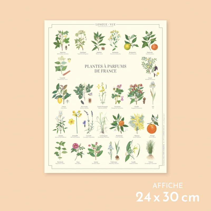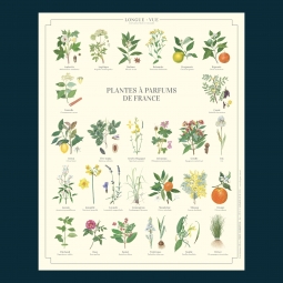 Affiche 24 x 30 cm - Plantes à parfums de France - Existe aussi en carte double 42 x 10 cm et affiche 40 x 60 cm - Illustration d'Elena COFFE-MARIJCHUK - Collection Plantes à parfums - Couleur du fond : Beige.