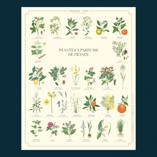 Ambrette . Angélique . Badiane . Balsamite . Bergamote . Bigarade . Cannelle . Cassie . Citron . Fève tonka . Genêt d'Espagne . Géranium . Girofle . Iris . Jasmin . Jonquille . Lavande . Lemongrass . Mandarine . Mimosa . Orange . Patchouli . Rose . Santal . Tubéreuse . Vanille . Vétiver