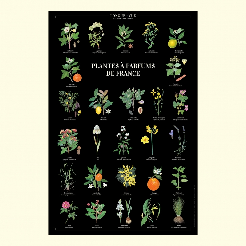 Affiche 40 x 60 cm - Plantes à parfums de France - Couleur du fond : Noire. Illustration d'Elena COFFE-MARIJCHUK - Collection Plantes à parfums . Plantes à parfums de France : Existe aussi en carte double 42 x 10 cm. 1. Ambrette (Abelmoschus moschatus) 2. Angélique (Angelica archangelica) 3. Badiane (Illicium verum) 4. Balsamine (Tanacetum balsamita) 5. Bergamote (Citrus bergamia) 6. Bigarade (Citrus aurantium) 7. Cannelle (Cinnamomum verum) 8. Cassie (Vachellia farnesiana) 9. Citron (Citrus limon) 10. Fève tonka (Dipteryx odorata) 11. Genêt d’Espagne (Spartium junceum) 12. Géranium (Pelargonium graveolens) 13. Girofle (Syzygium aromaticum) 14. Iris (Iris) 15. Jasmin (Jasminum grandiflorum) 16. Jonquille (Narcissus jonquilla) 17. Lavande (Lavandula angustifolia) 18. Lemongrass (Cymbopogon flexuosus) 19. Mandarine (Citrus reticulata) 20. Mimosa (Acacia dealbata) 21. Orange (Citrus sinensis) 22. Patchouli (Pogostemon cablin) 23. Rose (Rosa centifolia) 24. Santal (Santalum album) 25. Tubéreuse (Polianthes tuberosa) 26. Vanille (Vanilla planifolia) 27. Vétiver (Chrysopogon zizanioides) Sauvegarder la biodiversité, c’est aussi protéger les variétés et les espèces végétales cultivées.