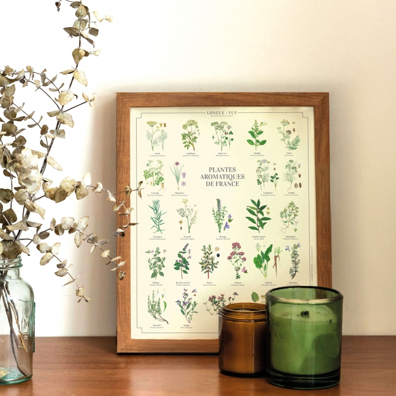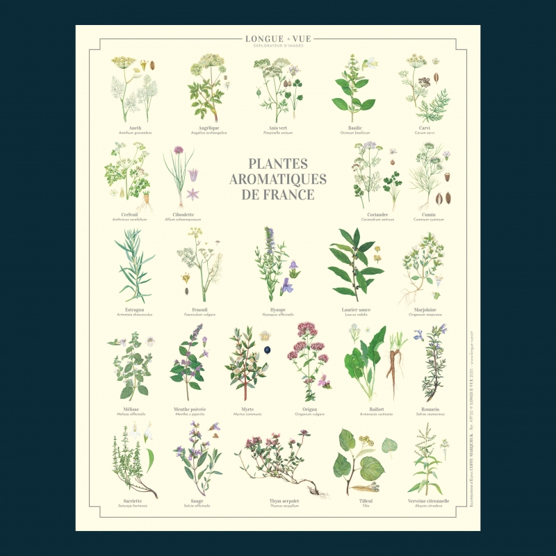 Affiche 24 x 30 cm - Plantes aromatiques de France - Existe aussi en carte double 42 x 10 cm et affiche 40 x 60 cm - Illustration d'Elena COFFE-MARIJCHUK - Collection Plantes aromatiques - Couleur du fond : Beige.