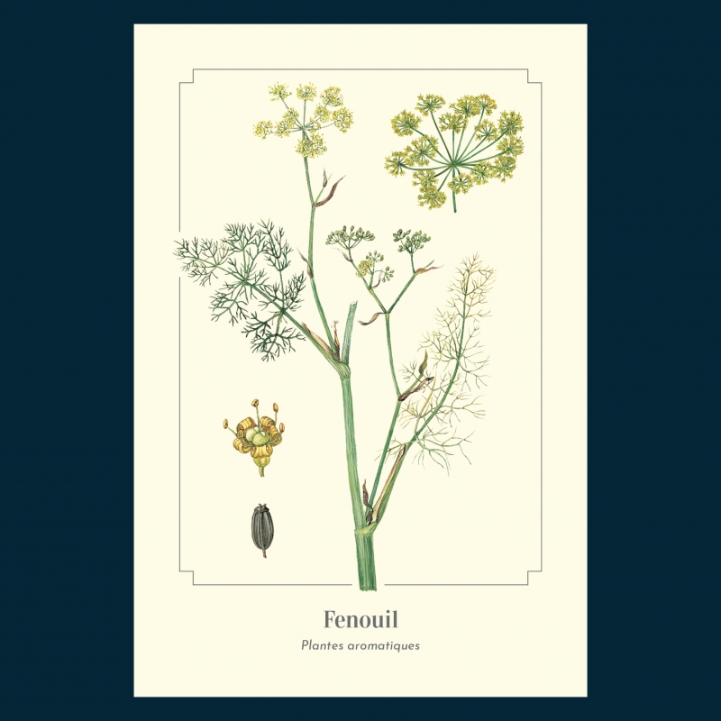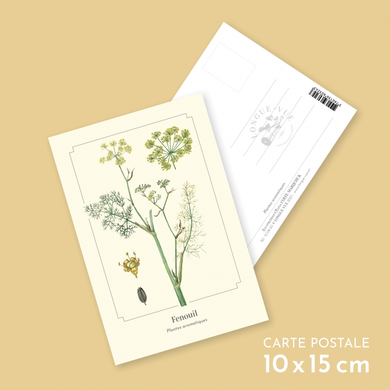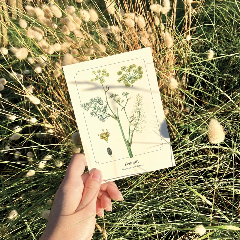 Carte postale 10 x 15 cm - Fenouil - Illustration d'Elena COFFE-MARIJCHUK - Collection Plantes aromatiques. Fenouil : Le fenouil est une plante vivace qui peut atteindre deux mètres de haut. Tout est bon dans le fenouil : les racines, les feuilles, les graines… Le goût, très proche de l’anis, est souvent associé en cuisine au poisson.