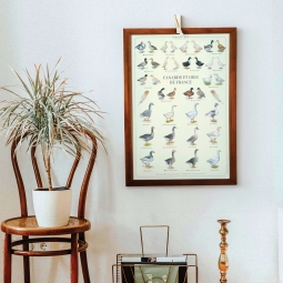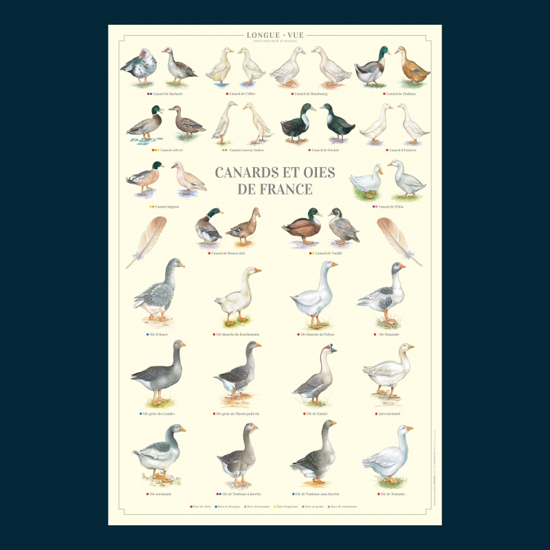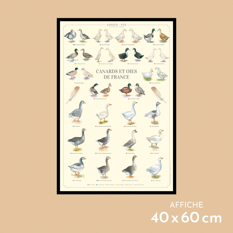 Affiche 40 x 60 cm - Canards et oies de France - Illustration de Christine PONCHON - Collection Oies et canards . Canards et oies de France : Existe aussi en carte double 42 x 10 cm. (1) Race de chair (2) Race d’ornement (3) Race de foie gras (4) Race d’appelant (5) Race de ponte (6) Race de croisement (7) Race de gibier CANARDS 1. Barbarie (1) (3) 2. Allier (1) 3. Bourbourg (1) 4. Challans (1) 5. Colvert (7) (2) (4) 6. Coureur indien (2) (5) 7. Duclair (1) 8. Estaires (1) 9. Mignon (4) (2) 10. Pékin (1) (6) 11. Rouen clair (1) 12. Vouillé (1) (4) OIES 1. Oie d’Alsace (3) 2. Oie blanche du Bourbonnais (1) 3. Oie flamande (1) 4. Oie grise des Landes (3) 5. Oie grise du Marais poitevin (1) 6. Oie de Guinée (1) 7. Jars normand (1) 8. Oie normande (1) 9. Oie blanche du Poitou (1) 10. Oie de Toulouse à bavette (3) (1) 11. Oie de Toulouse sans bavette (3) 12. Oie de Touraine (1) Sauvegarder la biodiversité, c’est aussi protéger les variétés et les espèces animales domestiques.