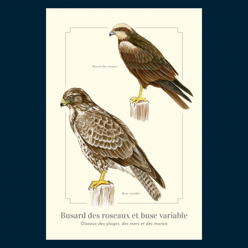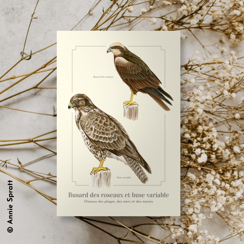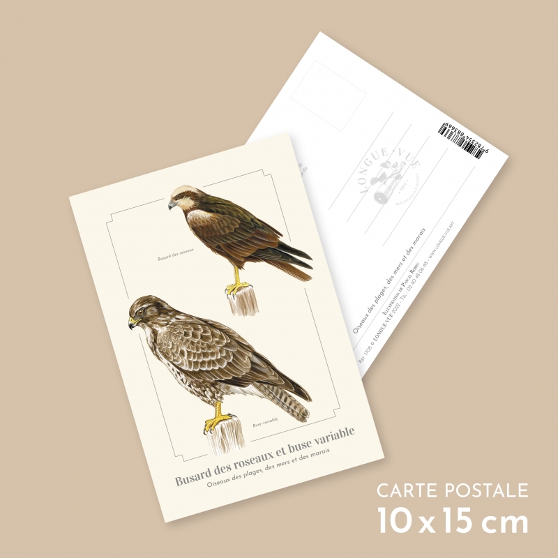 Carte postale 10 x 15 cm - Busard des roseaux et buse variable - Illustration de Pascal Robin - Collection Oiseaux des plages, des mers et des marais. Le Busard des roseaux et buse variable: Busard des roseaux (Circus aeruginosus) Taille : environ 56 cm, envergure : de 110 à 130 cm, poids : de 500 à 800 g, longévité : 17 ans. Buse variable (Buteo buteo) Taille : environ 57 cm, envergure : de 110 à 130 cm, poids : de 620 à 1 370 g, longévité : 25 ans. Le busard des roseaux niche en Bretagne, en grande partie sur les marais littoraux, et aime s’attaquer à toutes sortes de proies faciles ou d’animaux morts. La buse variable est le rapace le plus commun d’Europe centrale. On considère qu’elle a la vue la plus perçante de tous les oiseaux de proie. Un couple établit un territoire et y restera toute sa vie.