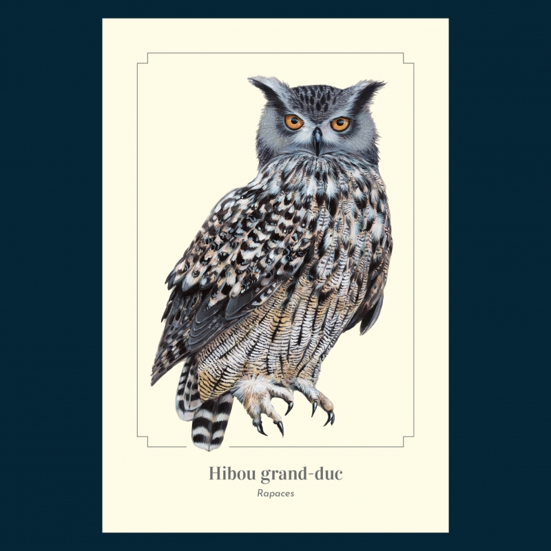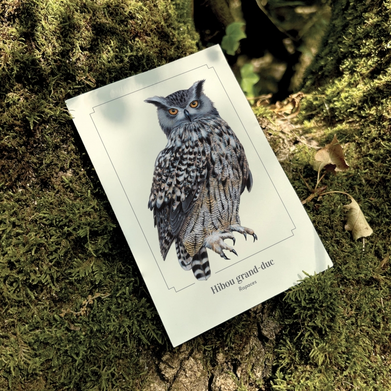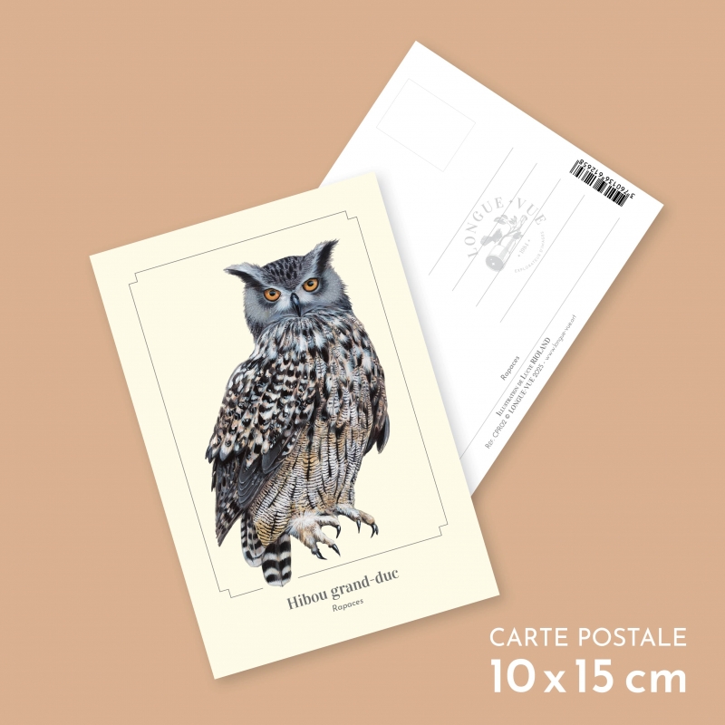Carte postale 10 x 15 cm - Hibou grand-duc - Illustration de Lucye Rioland - Collection Rapaces.