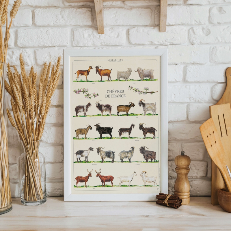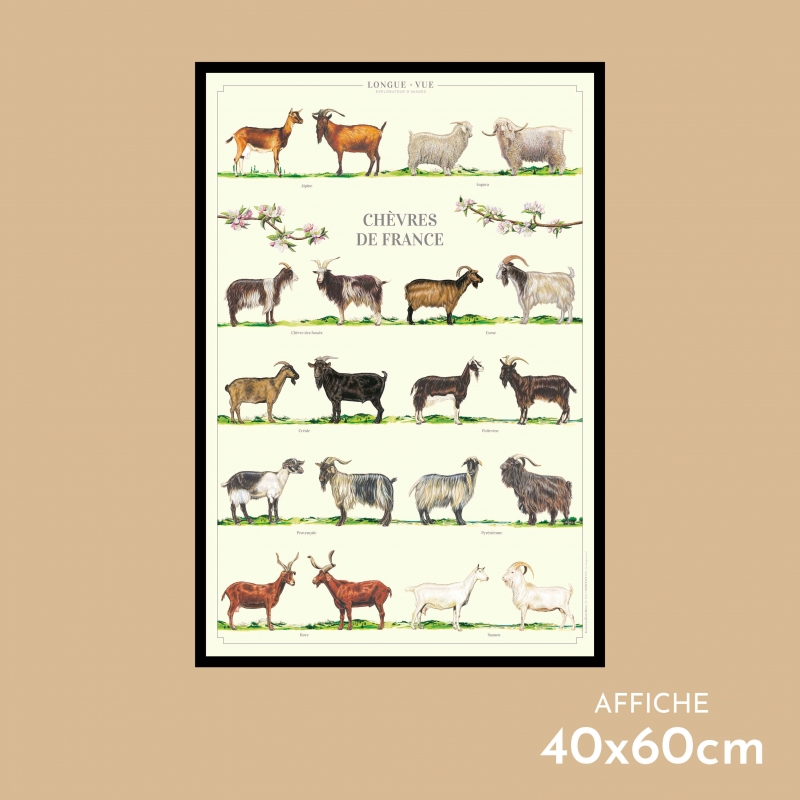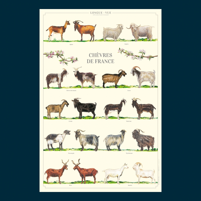 Affiche 40 x 60 cm - Chèvres de France - Illustration d'Elodie DUMOULIN - Collection Chèvres et moutons. Chèvres de France : 1. Alpine 2. Angora 3. Chèvre des fossés 4. Corse 5. Créole 6. Poitevine 7. Provençale 8. Pyrénéenne 9. Rove 10. Saanen Sauvegarder la biodiversité, c’est aussi protéger les variétés et les espèces animales domestiques.